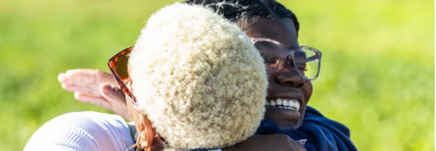 Two smiling Black women standing outdoors on green grass with trees in the background.